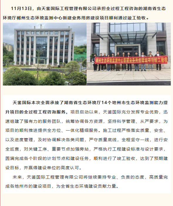 郴州生态环境中心新建业务用房顺利完成竣工验收