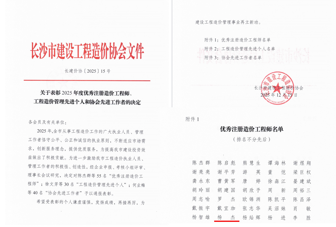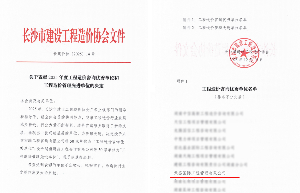 喜讯!天鉴国际工程管理有限公司的专业能力和服务质量再次获得行业协会的权威认可。天鉴国际被长沙市建设工程造价协会评为“工程造价咨询优秀单位”,天鉴国际造价总经理杨杰被评为“优秀注册造价工程师”。