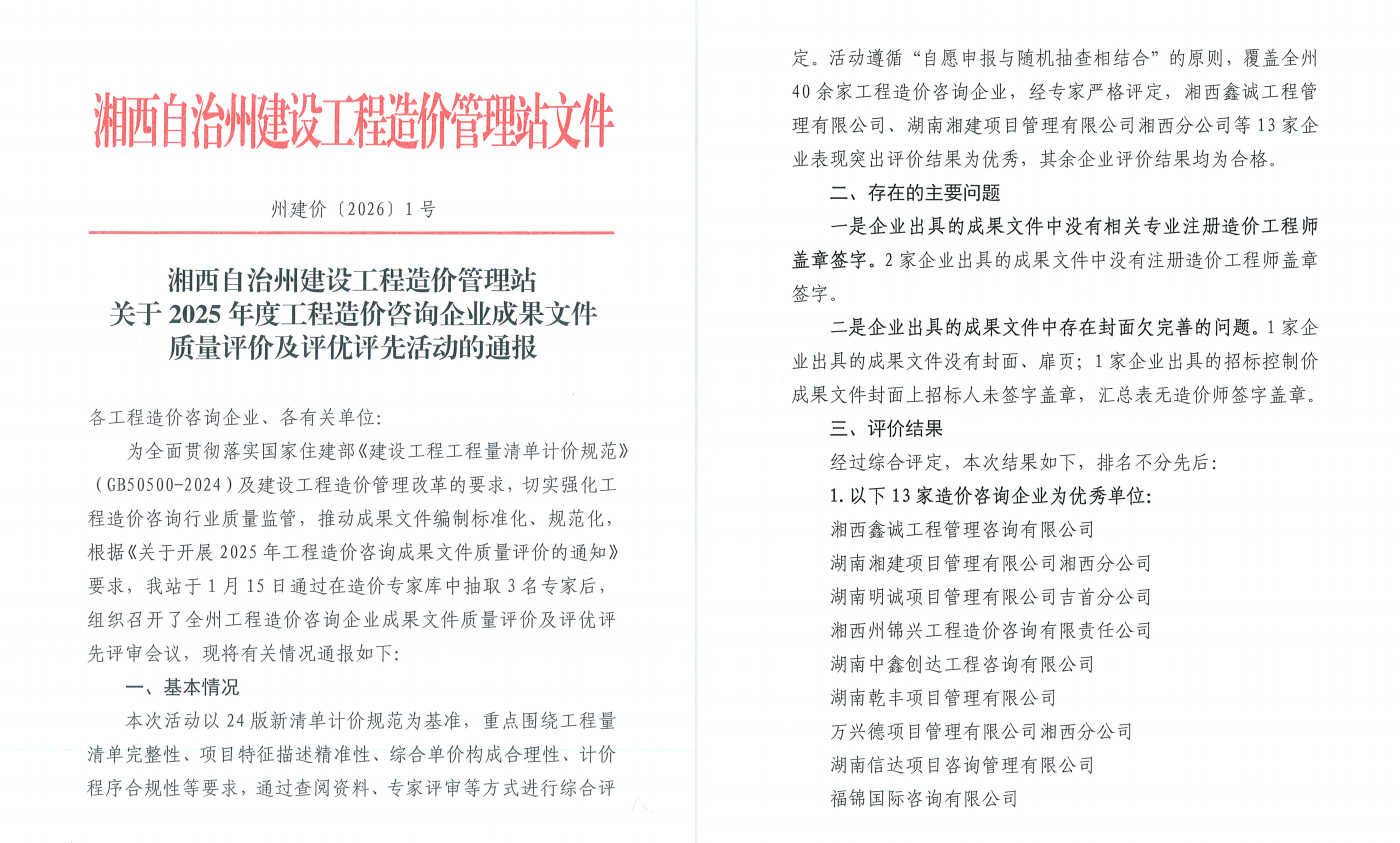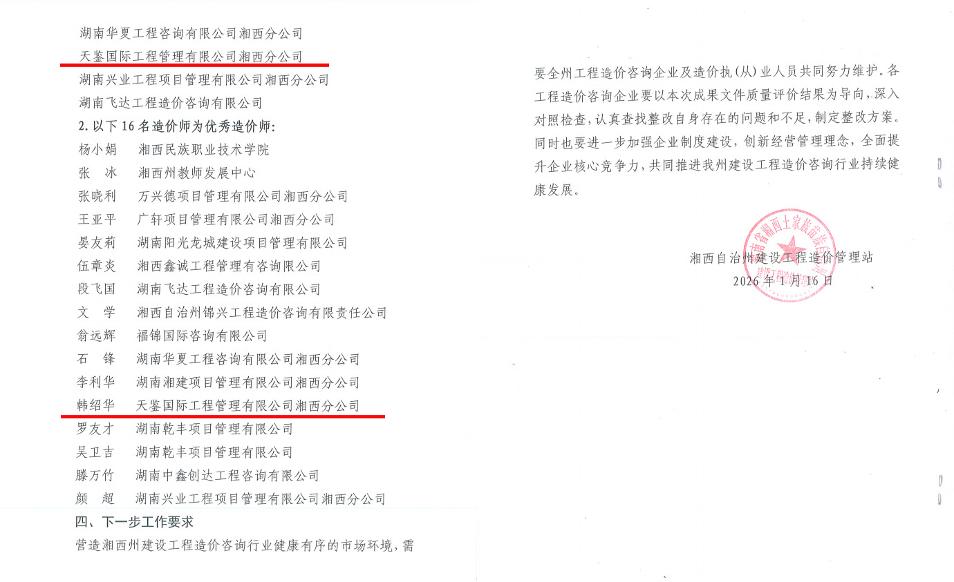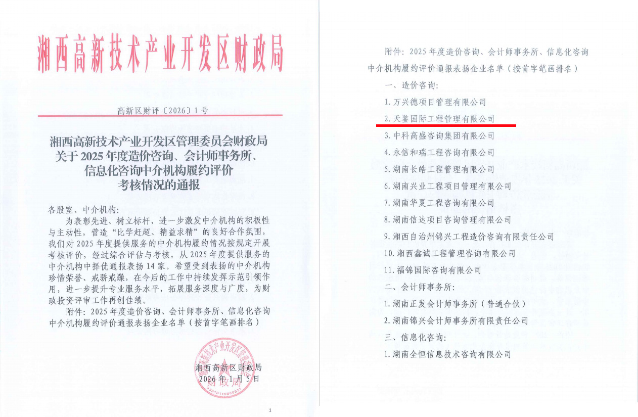 近日,湘西自治州建设工程造价管理站与湘西高新技术产业开发区管理委员会财政局分别公布了2025年度评价考核结果,天鉴国际工程管理有限公司喜获双重认可,倍感荣幸,亦深受鼓舞。