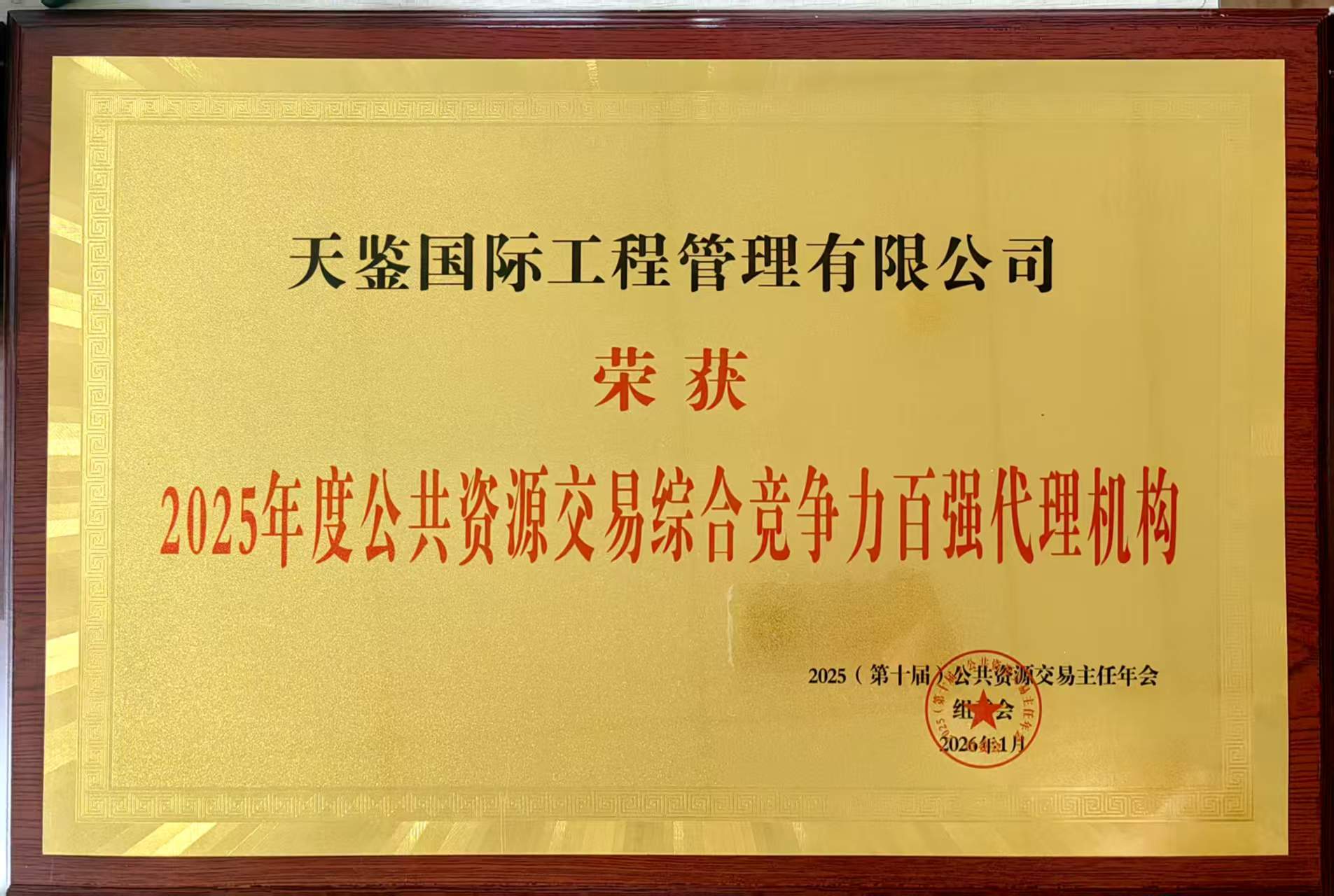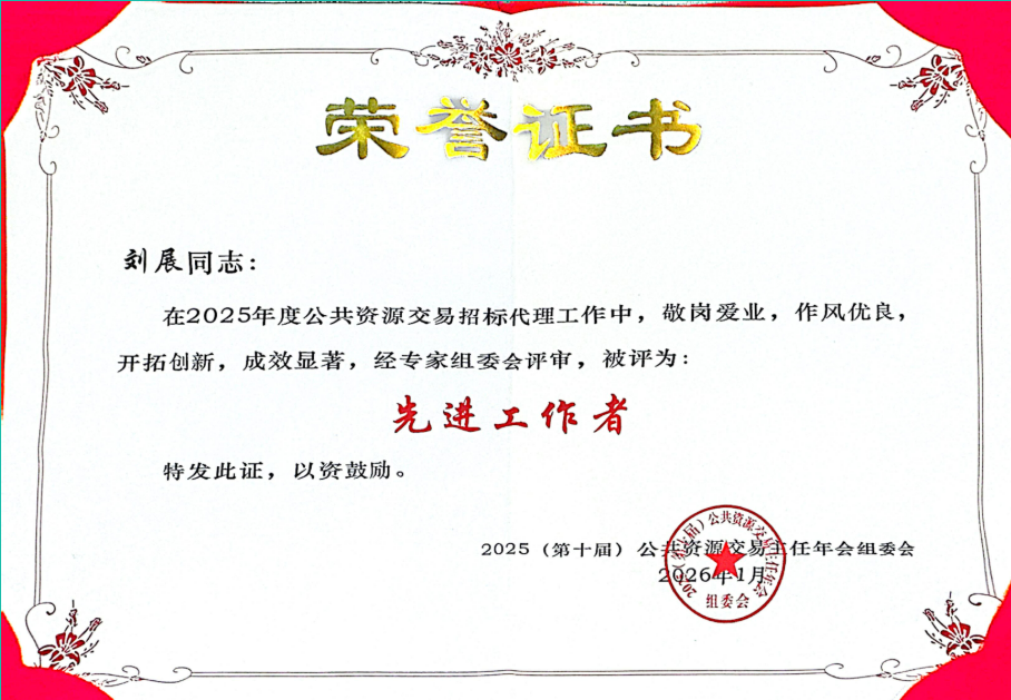 天鉴国际被第十届公共资源交易主任年会组委会评为“2025年度公共资源交易综合竞争力百强代理机构”,我司总经理刘展敬岗爱业,作风优良,开拓创新,成效显著,获评“先进工作者”称号。这一奖项体现了天鉴国际在全国公共资源交易服务体系中的专业竞争力。