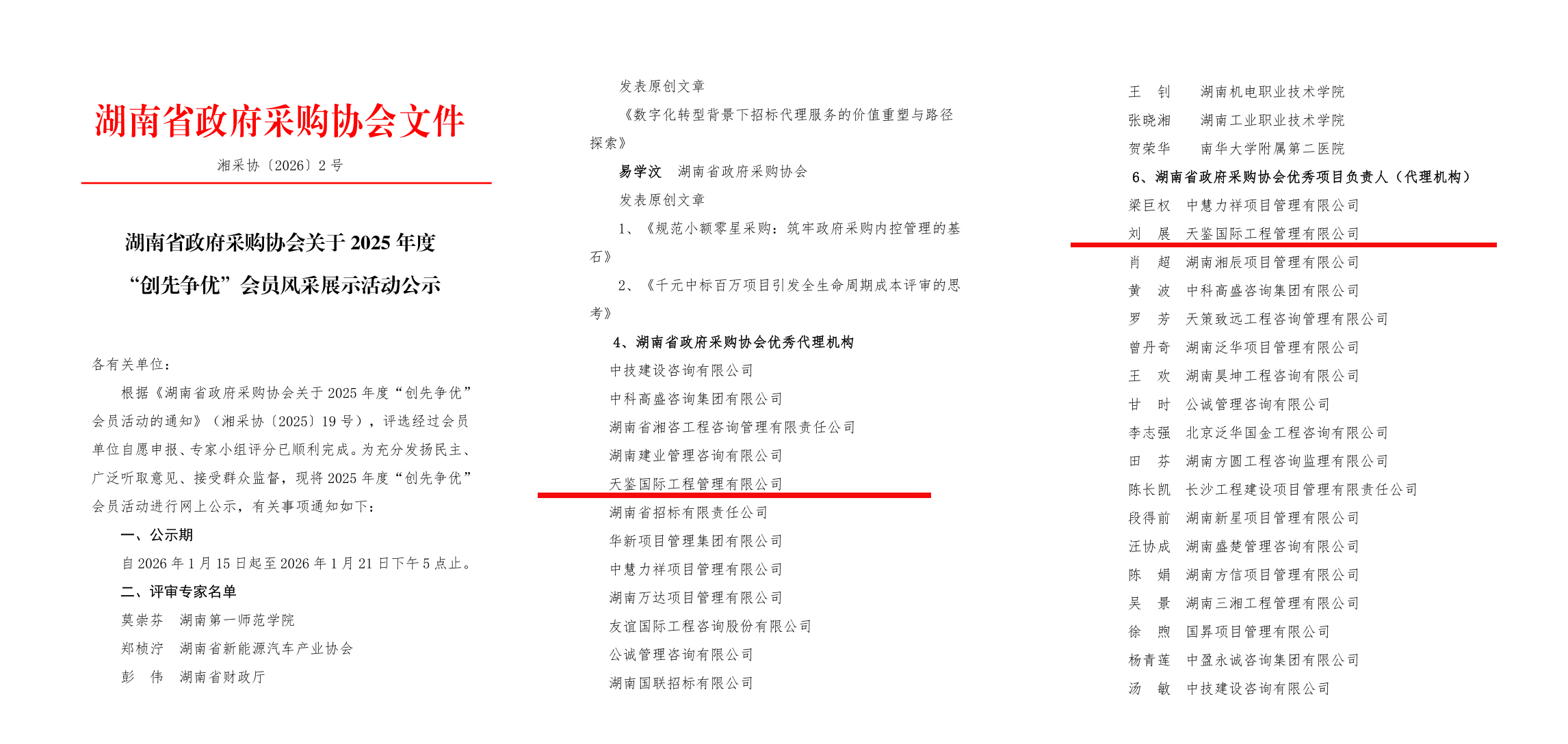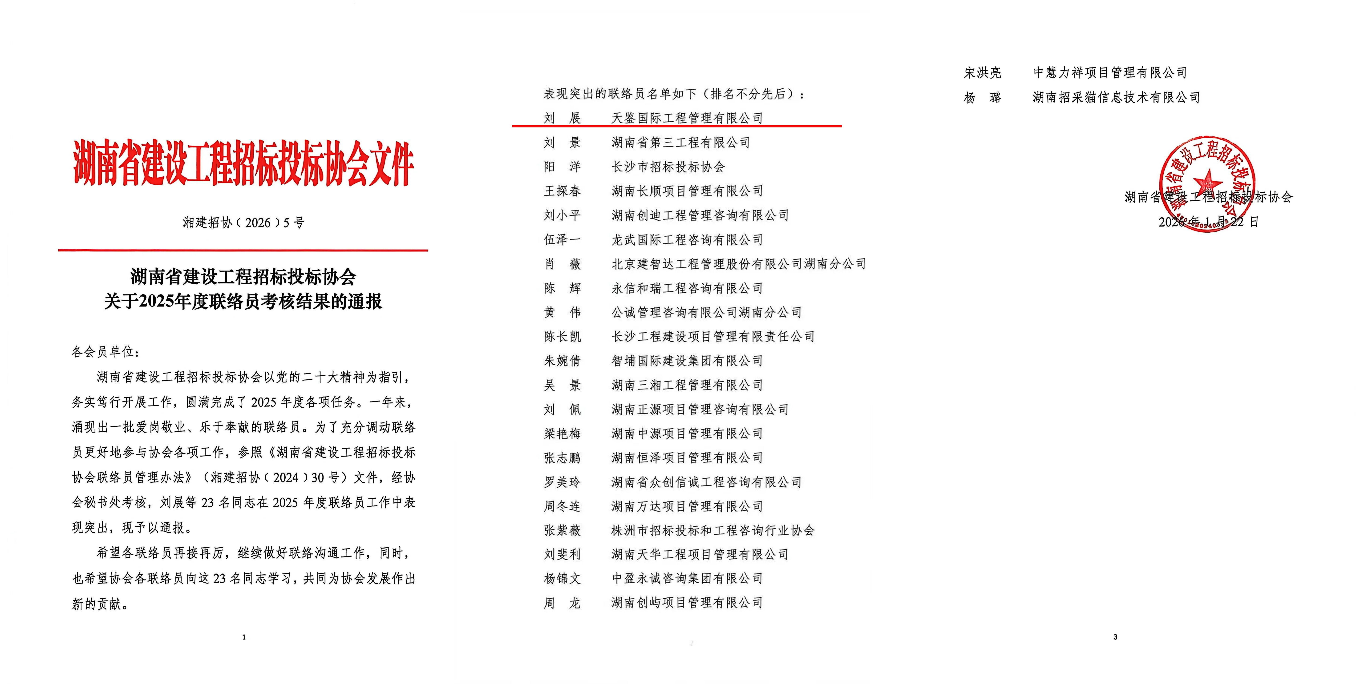 在省级评选中,我司亦屡获肯定,入选湖南省建设工程招标投标协会“2025年度积分排名前列的会员单位”,总经理刘展获评“2025年度联络员”;在湖南省政府采购协会2025年度“创先争优”会员活动中,我司获评“湖南省政府采购协会优秀代理机构”,总经理刘展获评“湖南省政府采购协会优秀项目负责人”。充分体现了我司在推动行业交流、健康发展中的示范作用。