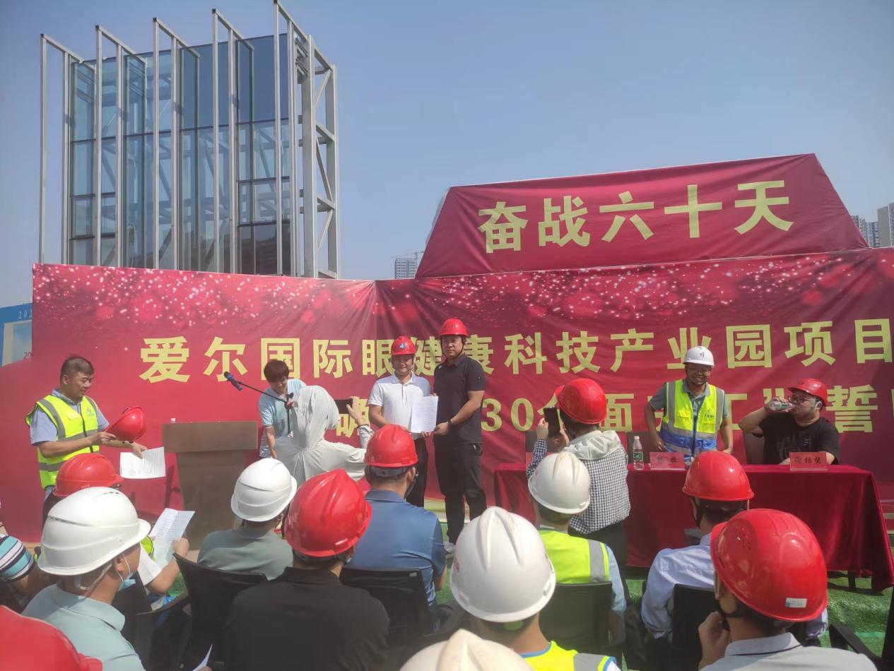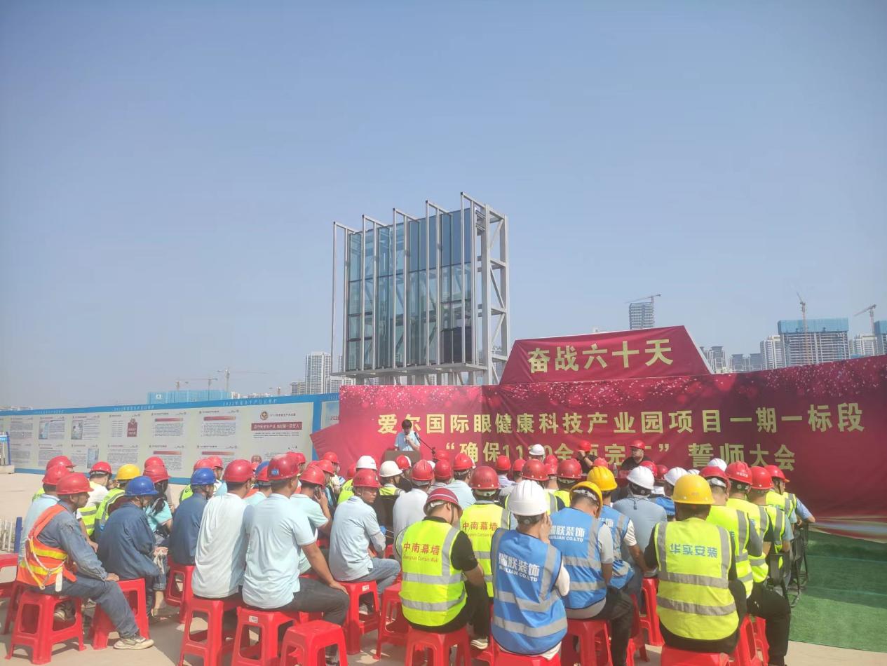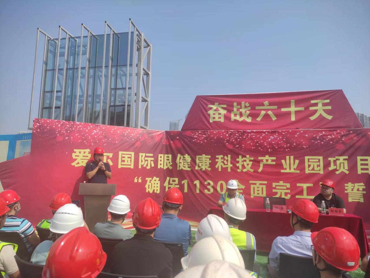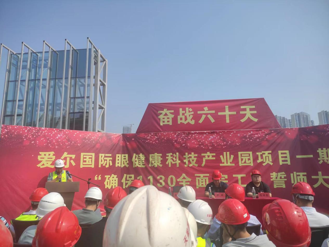 金戈铁马闻战鼓,只争朝夕启征程!9月27日,爱尔国际眼健康科技产业园举行爱尔国际眼健康科技产业园项目一期一标段奋战六十天“确保1130全面完工”誓师大会。来自建设单位、监理单位、总分包单位公司高管、项目负责人和工程建设者共计90余人参会。我司总监理工程师吴汉明参加大会并发表讲话。