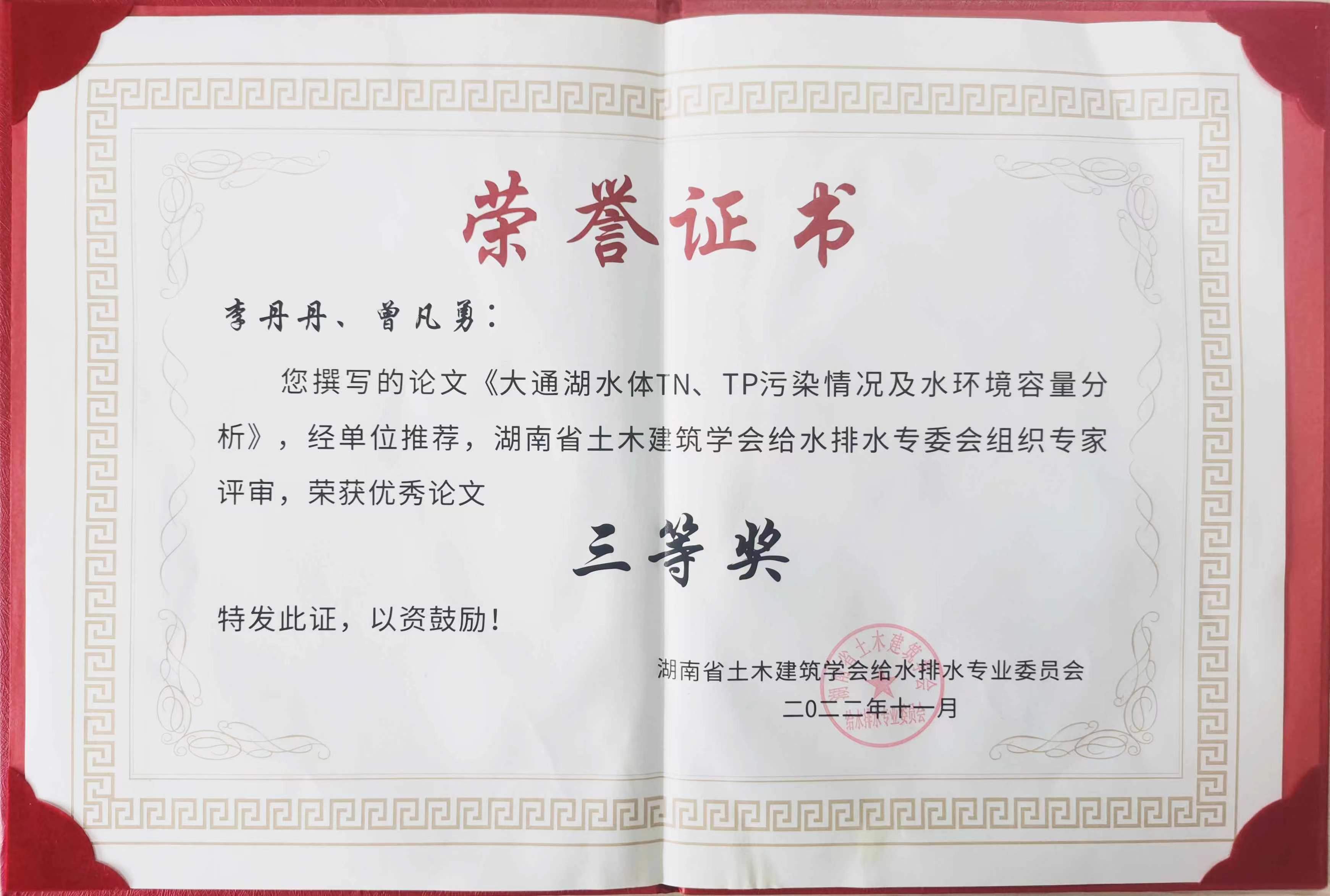 同时在“湖南省土木建筑学会给水排水专业委员会成立四十周年庆暨颁奖晚会”上,曾凡勇与李丹丹共同撰写的论文《大通湖水体TN、TP污染情况及水环境容量分析》荣获了湖南省土木建筑学会给水排水专业委员会优秀论文三等奖。