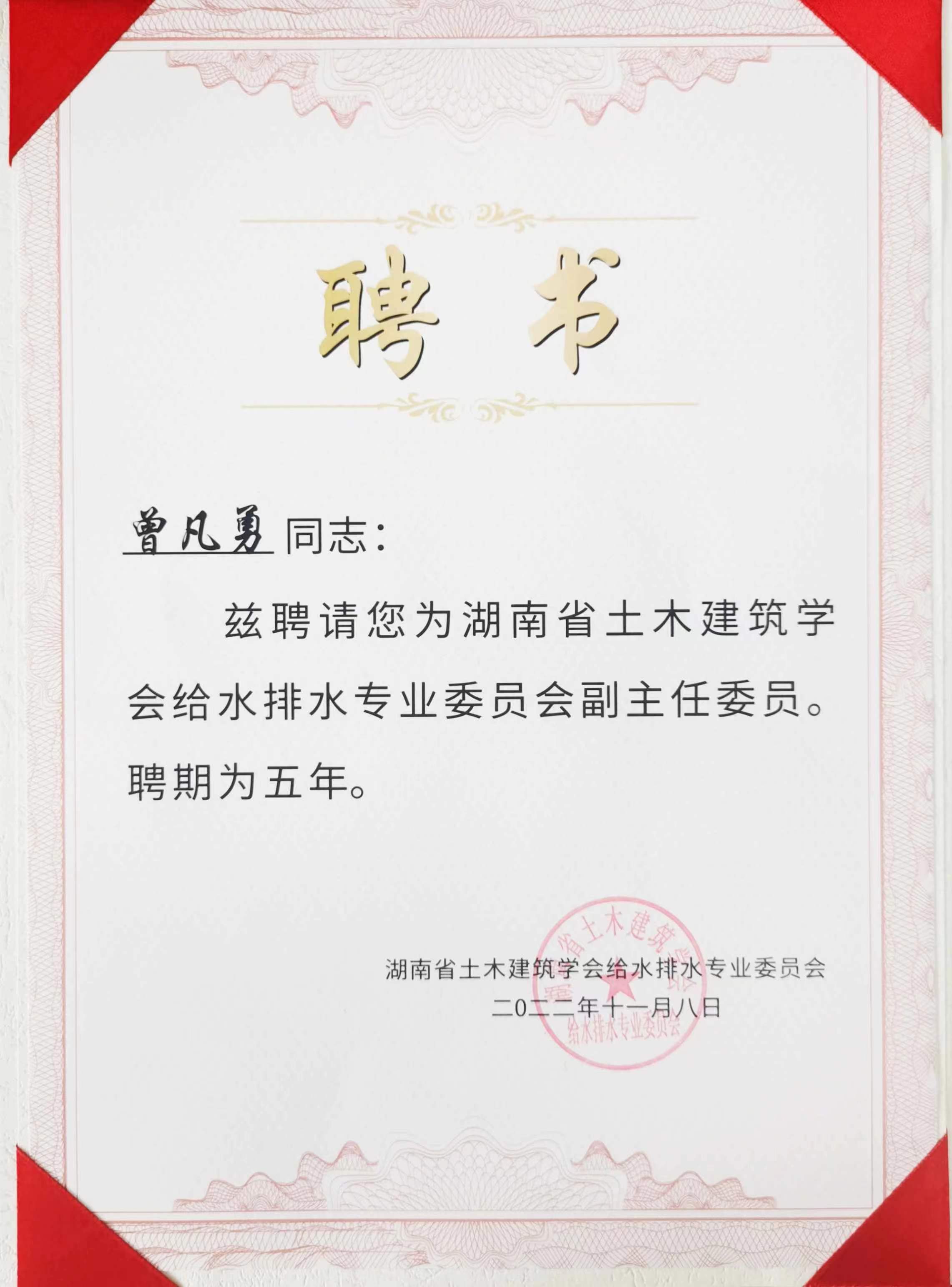 喜报!我司咨询总经理曾凡勇受聘为湖南省土木建筑学会给水排水专业委员会副主任委员