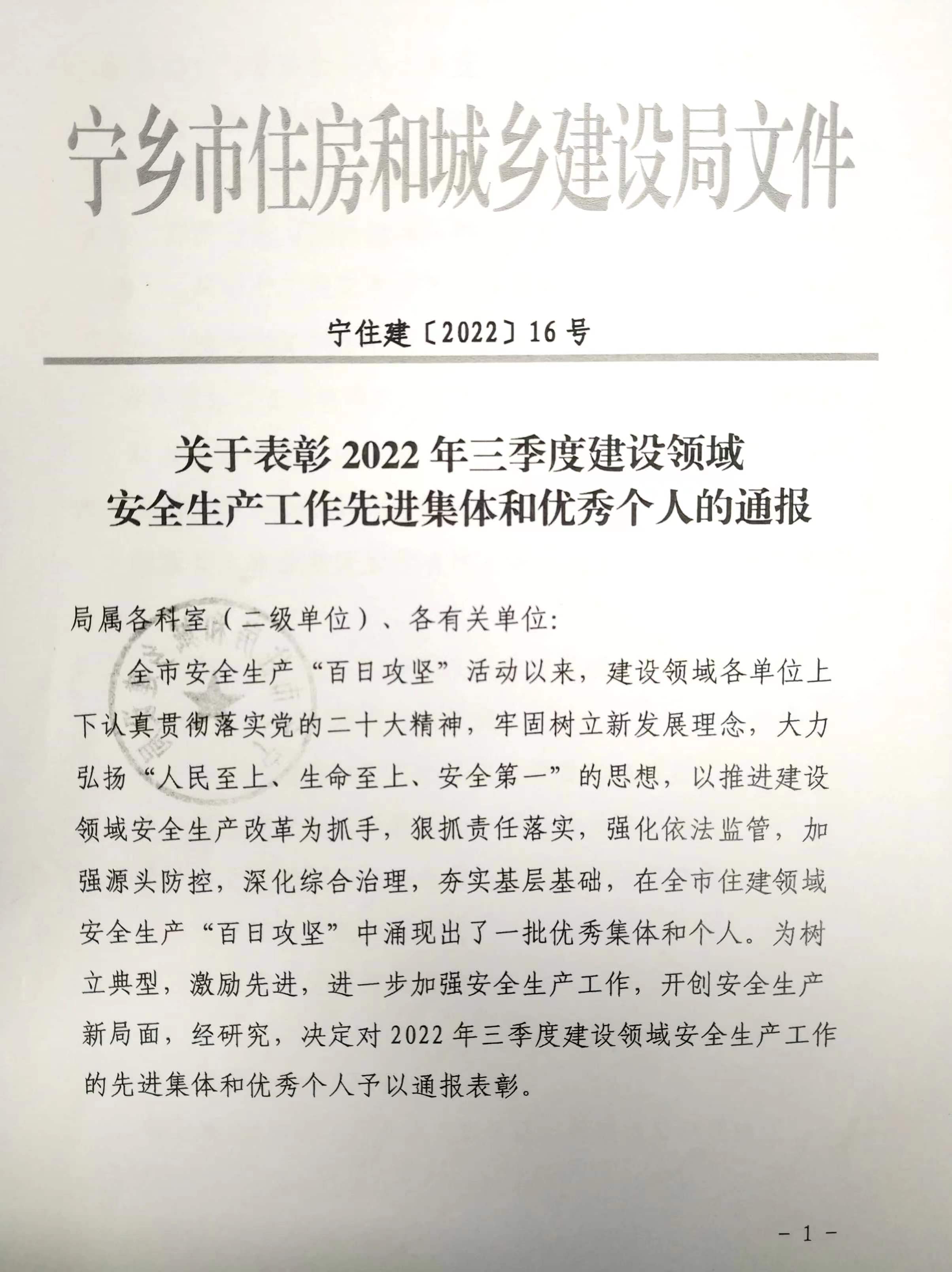 喜报!我司监理部杨晖同志获宁乡市“2022年三季度建设领域安全生产工作优秀个人”