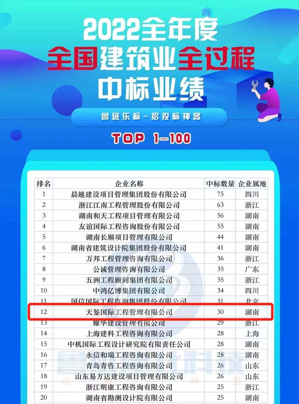 1月12日,鲁班乐标发布“2022全年度全国建筑业全过程中标业绩100强”榜单,天鉴国际工程管理有限公司以中标30个项目位居榜单第12位。