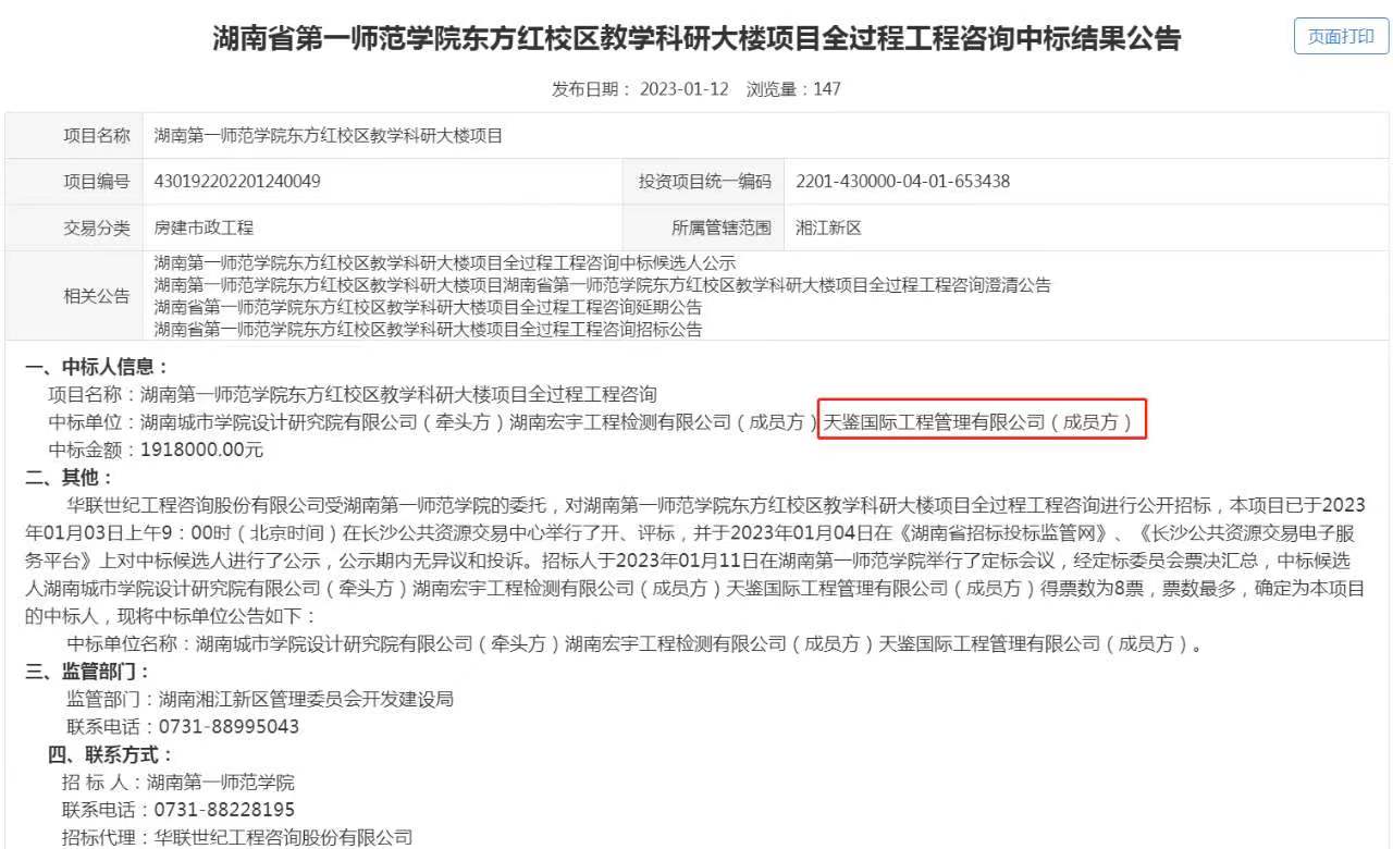 该项目中标是我司取得湖南省第一师范学院东方红校区学生宿舍17号楼项目标段后,再次与湖南省第一师范学院东方红校区合作,这无疑是业主对天鉴服务能力的再次认可,也是对公司提升服务品质的鼓励和鞭策。